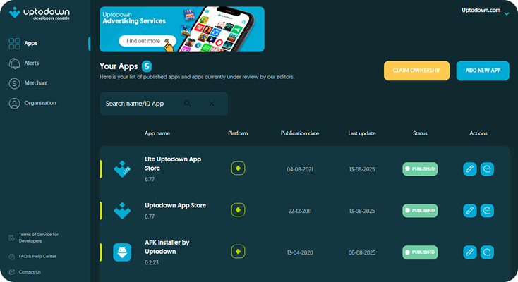 Uptodown Developers Console is our app publishing platform, where any creator—whether a hobbyist or a major publisher—can distribute software for Android, Windows, or Mac free of charge and without restrictions.